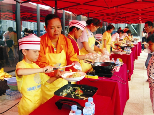 本報(bào)訊 昨日上午,南寧經(jīng)濟(jì)技術(shù)開發(fā)區(qū)在綠港·國際中心開展了以“關(guān)愛農(nóng)民工·綠港小廚神”親子活動(dòng),吸引了南寧經(jīng)開區(qū)園林綠化工人、水電維修物業(yè)工人、保潔人員等300多名進(jìn)城務(wù)工人員及其子女參加。在活動(dòng)現(xiàn)場(chǎng),參賽小選手們?cè)诟改傅闹笇?dǎo)下井井有條地備菜、炒菜、起鍋,忙得不亦樂乎。