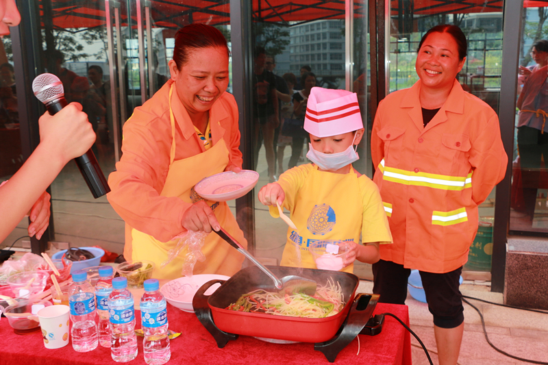 搶答活動結(jié)束之后,進入“小廚神”廚藝大比拼環(huán)節(jié)。由園林綠化工人、水電維修物業(yè)工人、保潔人員等進城務工人員組成的5組家庭展開了激烈的廚藝大比拼競賽??矗N神們在父母的指導下井井有條地備菜、炒菜、起鍋,忙得不亦樂乎。各色菜式色香味俱全,充分展現(xiàn)了孩子們“小當家”的本領。半小時后,小廚神們在大家的熱烈掌聲中完成了比賽菜品,廚藝大師及現(xiàn)場觀眾根據(jù)完成的速度、菜品、味道等評出廚藝大賽一等獎1名,二等獎2名,三等獎3名,優(yōu)秀獎10名。