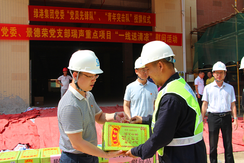 綠港集團(tuán)黨委書記、董事長、總經(jīng)理龔國強(qiáng)給一線員工送上清涼飲品