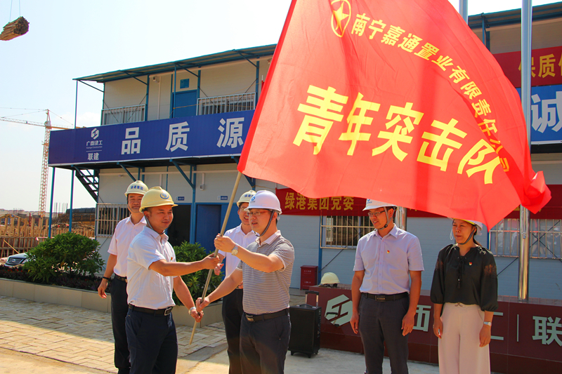 在授旗儀式中,集團(tuán)黨委書記、董事長、總經(jīng)理龔國強(qiáng)對南寧科技產(chǎn)業(yè)園項(xiàng)目人員前期所做出的工作給予了充分肯定,贊揚(yáng)了黨員先鋒隊員、青年突擊隊員和工人朋友們?yōu)轫?xiàng)目建設(shè)所付出的艱苦和努力,當(dāng)前項(xiàng)目進(jìn)展取得了較好的成績。自8月12日南寧科技產(chǎn)業(yè)園項(xiàng)目正式開工以來,嘉通公司黨支部帶領(lǐng)工人們?nèi)找箍喔?,千方百計克服惡劣的臺風(fēng)天氣等不利因素,在短短的2個月時間便完成1#樓廠房一層的搭設(shè)模板,2#、3#樓回填基礎(chǔ)土方,4#樓防水保護(hù)層澆筑以及9#宿舍樓基礎(chǔ)承臺澆筑等工作,充分展現(xiàn)了綠港鐵軍風(fēng)采。下一步,希望全體黨員先鋒隊、青年突擊隊隊員們以此次授旗為契機(jī),繼續(xù)發(fā)揚(yáng)綠港鐵軍精神,創(chuàng)先爭優(yōu),攻堅克難,加快推進(jìn)項(xiàng)目建設(shè),確保項(xiàng)目如期建成交付。