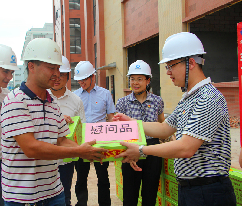 在建黨98周年前夕,綠港集團黨委攜集團工會和榮鑫公司黨支部開展以“送清涼、送健康、送安全”為主題的重點項目一線“送清涼”慰問活動。6月19日下午,集團黨委書記、董事長、總經(jīng)理龔國強帶領(lǐng)集團領(lǐng)導(dǎo)班子,頂著烈日、迎著熱浪,來到集團重點項目——瑞聲科技(南寧)廠房裝修工程(二期)施工現(xiàn)場,親切慰問看望在炎炎夏日中奮戰(zhàn)在項目建設(shè)一線的“黨員先鋒隊”、“青年突擊隊”隊員及各施工班組的建設(shè)者,送去了集團黨委、集團工會和榮鑫公司黨支部的關(guān)心和敬意,為他們加油鼓勁、提振士氣。