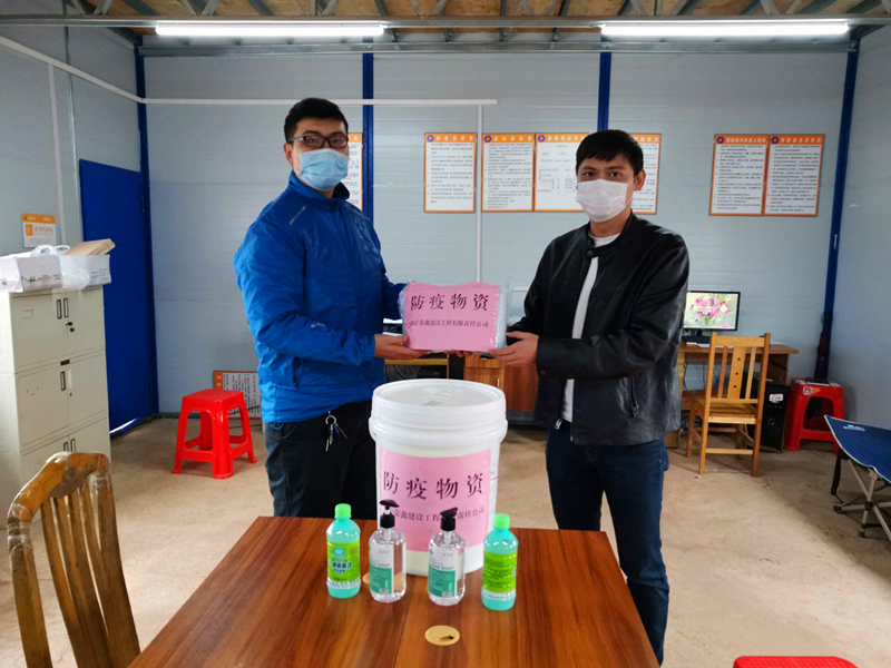 榮鑫公司副總經理黎杰代表公司為項目現(xiàn)場送上防疫物資