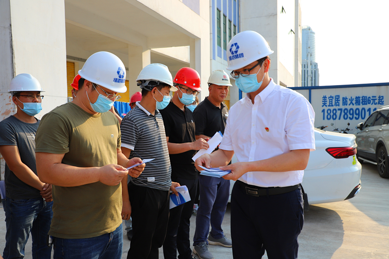 綠港集團(tuán)黨委副書記、總經(jīng)理鄧?yán)^慧給項(xiàng)目一線人員發(fā)放《工程建設(shè)廉政手冊(cè)》(張彩秀 攝)