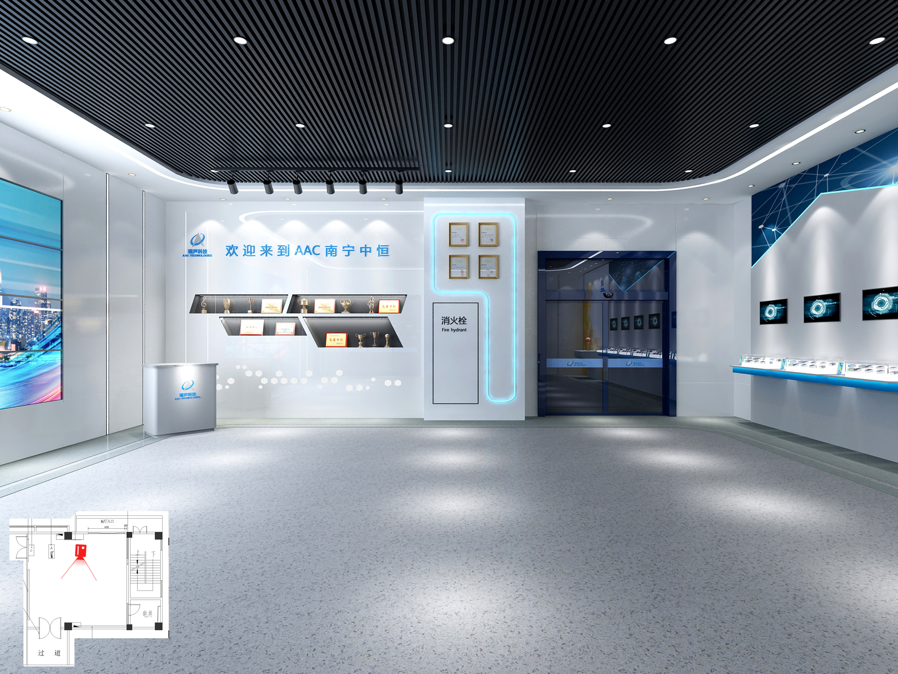 瑞聲光學(xué)模組科技展廳由兩個(gè)子展廳組成。此次科技展廳裝修內(nèi)容包括展廳外的市政設(shè)施改造、園林景觀改造,還包括展廳內(nèi)地面、墻面、天面裝飾裝修,給排水系統(tǒng)、消防系統(tǒng)改造、智能化系統(tǒng)等高標(biāo)準(zhǔn)的工作內(nèi)容。
