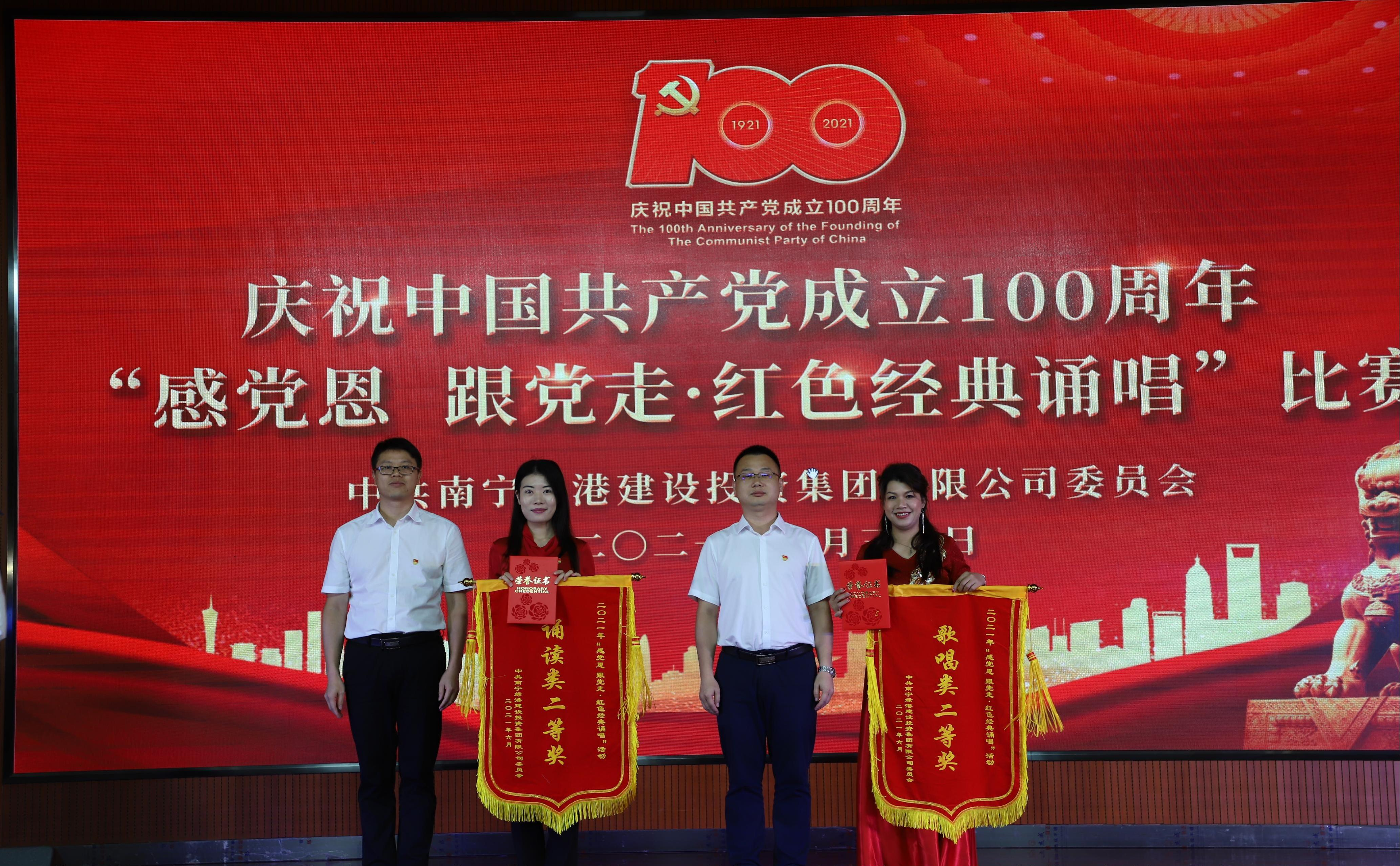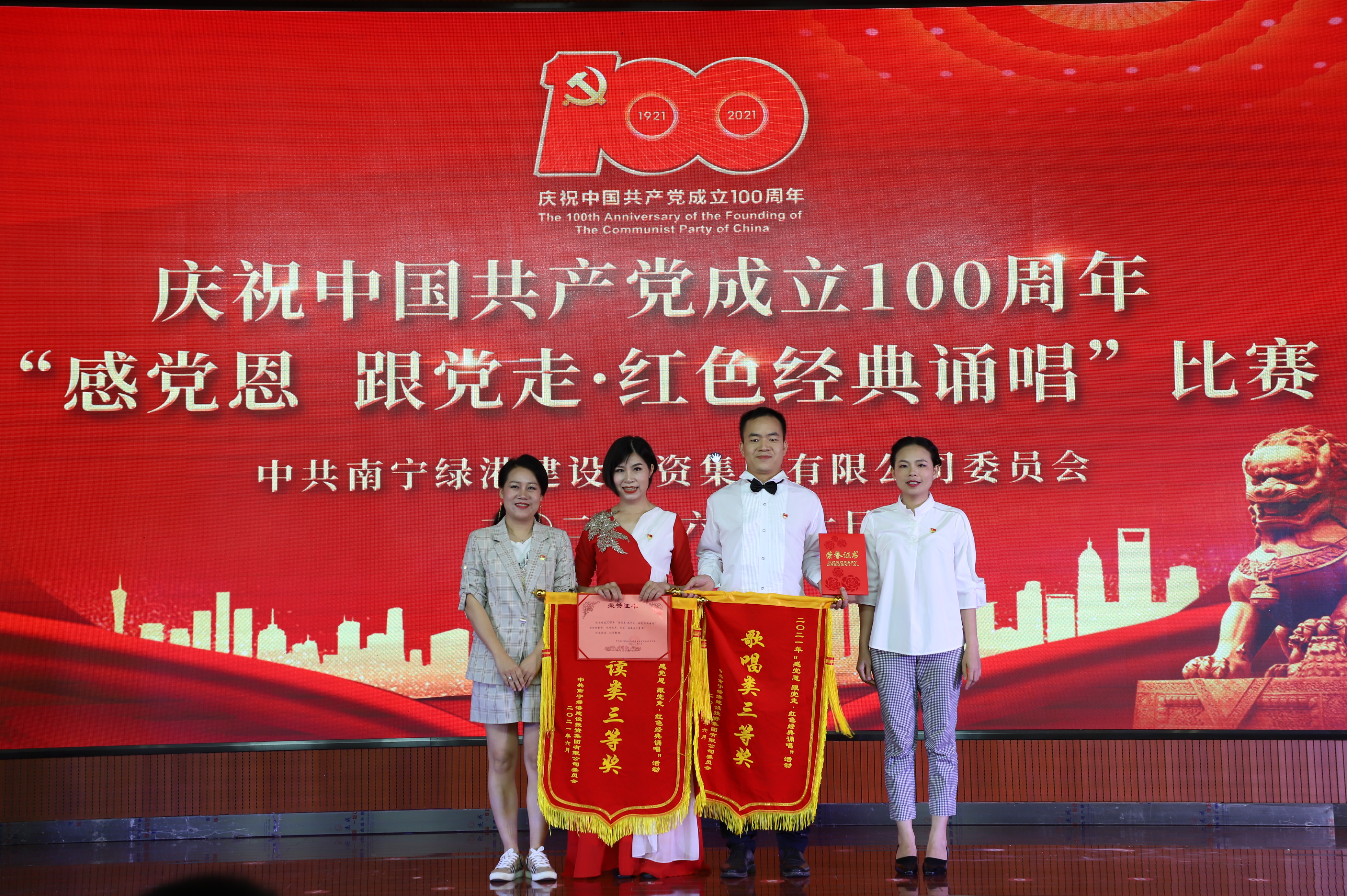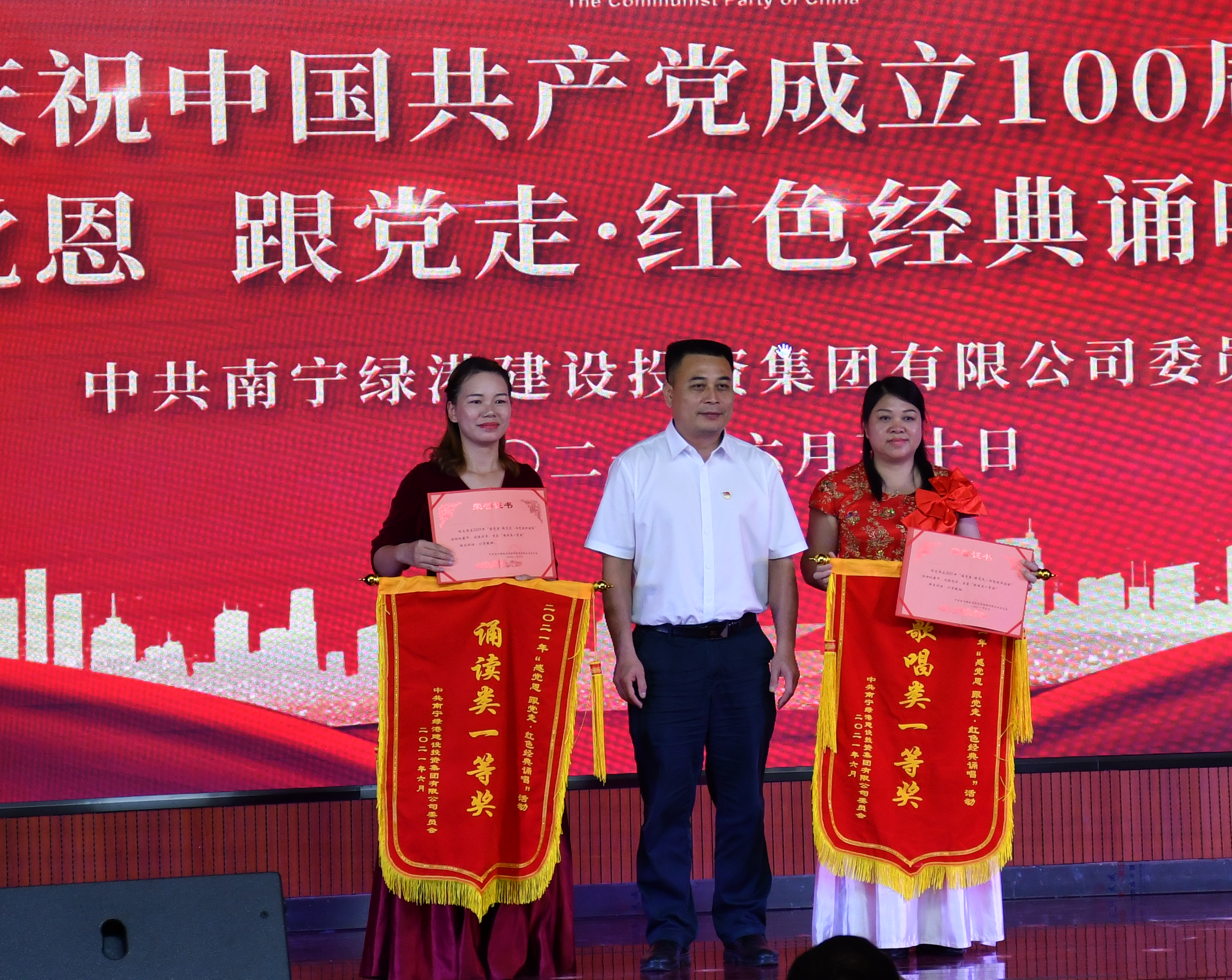 綠港集團黨委書記、董事長龔國強和黨委副書記、總經(jīng)理鄧繼慧為獲得誦唱類二等獎的機關(guān)一支部頒獎