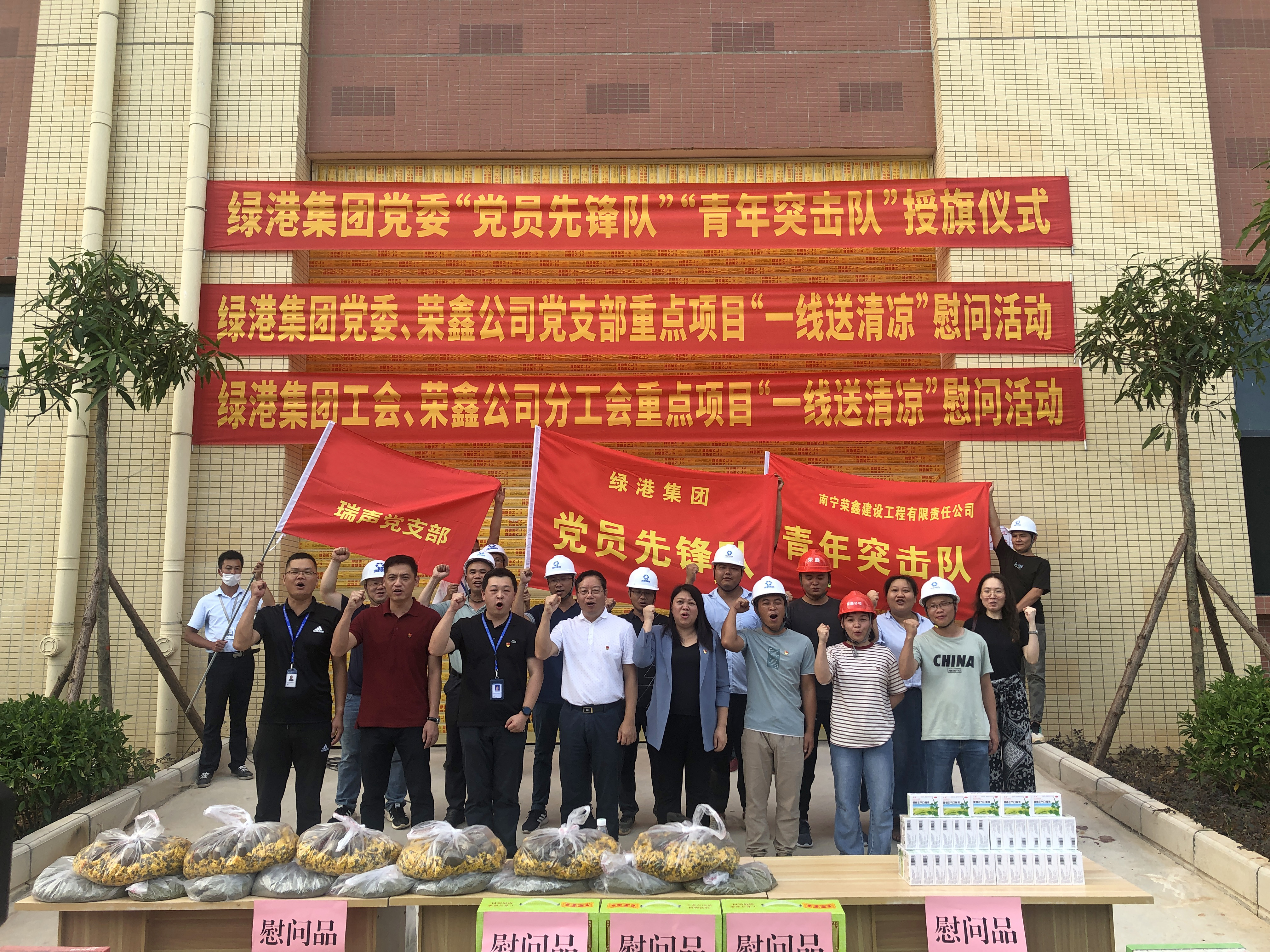 7月14日,由綠港集團(tuán)黨委主辦,榮鑫公司黨支部、榮鑫公司工會(huì)承辦的 “黨員先鋒隊(duì)”“青年突擊隊(duì)”授旗暨“一線送清涼”活動(dòng)在瑞聲三期項(xiàng)目現(xiàn)場(chǎng)開(kāi)展。榮鑫公司黨支部書(shū)記、總經(jīng)理李汝埠帶領(lǐng)榮鑫公司領(lǐng)導(dǎo)班子,頂著烈日、迎著熱浪,來(lái)到集團(tuán)重點(diǎn)項(xiàng)目——瑞聲科技(南寧)廠房裝修工程(三期)施工現(xiàn)場(chǎng),親切看望慰問(wèn)在炎炎夏日中奮戰(zhàn)在項(xiàng)目建設(shè)一線的“黨員先鋒隊(duì)”“青年突擊隊(duì)”隊(duì)員及各施工班組的建設(shè)者,送去了集團(tuán)黨委、榮鑫公司黨支部、榮鑫公司工會(huì)的關(guān)心和敬意,為他們加油鼓勁、提振士氣。瑞聲科技(南寧)有限公司副總經(jīng)理李博及項(xiàng)目相關(guān)負(fù)責(zé)人參加活動(dòng)。