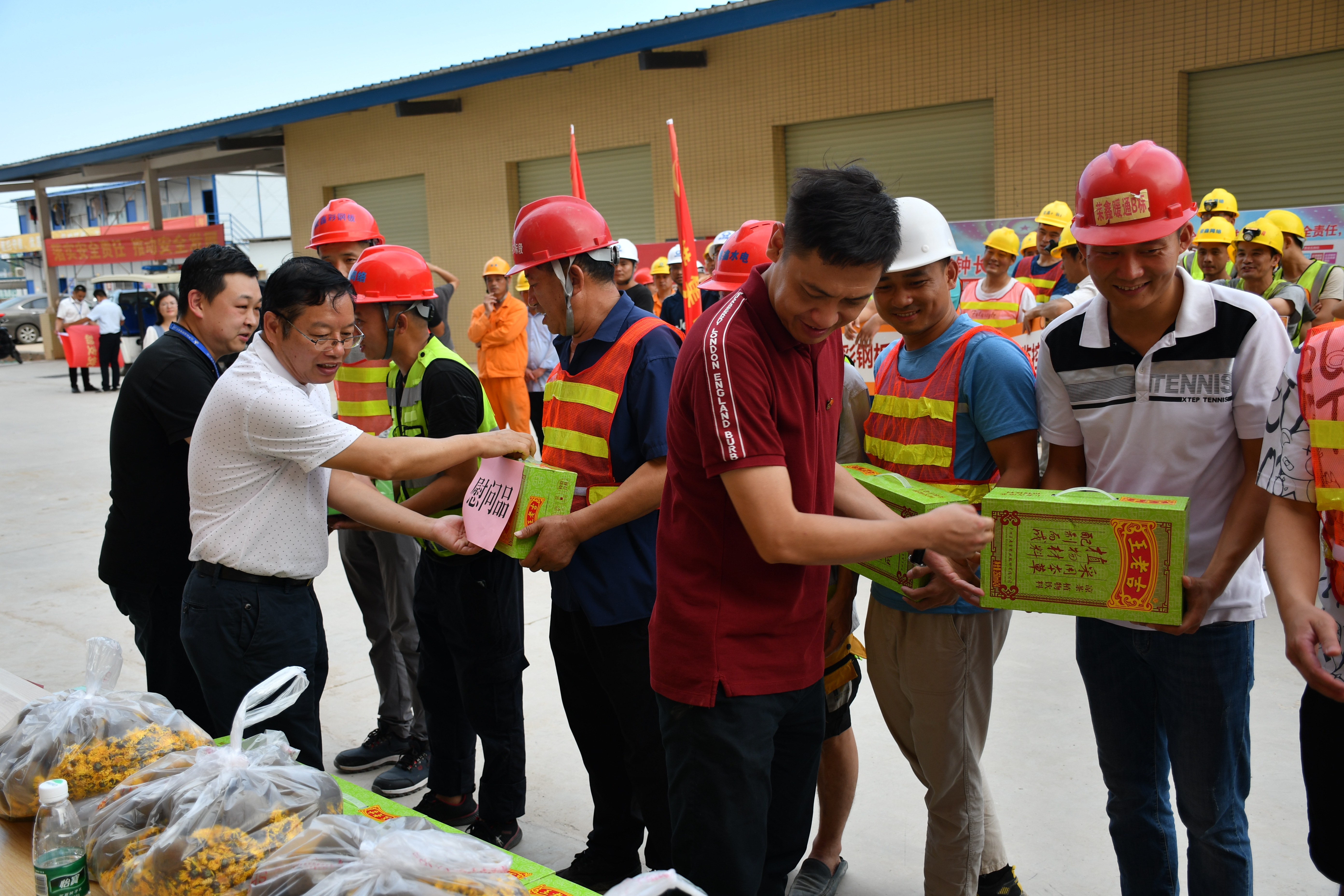 最后,榮鑫公司領(lǐng)導(dǎo)班子與瑞聲公司相關(guān)領(lǐng)導(dǎo)一起為一線勞動(dòng)者送上了藿香正氣液、王老吉清涼飲料、西瓜和菊花、羅漢果等清涼慰問(wèn)品,為沉悶炎熱的工地送去一片清涼。