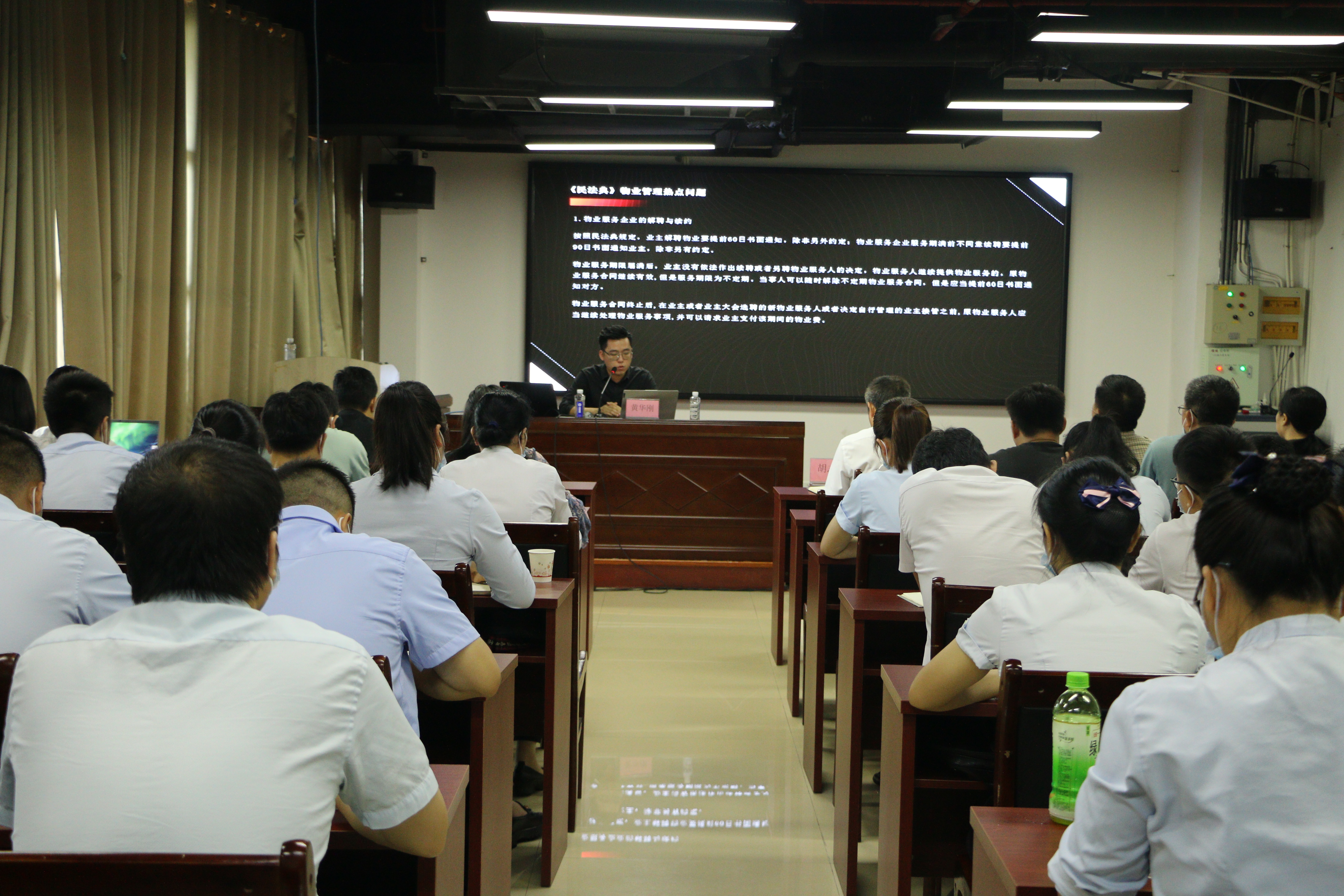 此次培訓,由集團法律顧問、廣西創(chuàng)想律師事務所黃華剛律師主講。黃華剛律師對《民法典》中關于物業(yè)服務的重點內容和熱點問題進行了詳細的解讀,同時針對物業(yè)公司在管理過程中應當注意的法律問題展開了詳細的論述,并且對公司以往案件中存在的問題進行了梳理和分析,最后提出了具有針對性和實用性的法律意見。整場培訓十分精彩,集學術性和實用性于一體,具有很強的理論性、指導性和實踐性,讓大家對《民法典》中物業(yè)服務的相關知識有了更直觀、更深入的認識和理解。