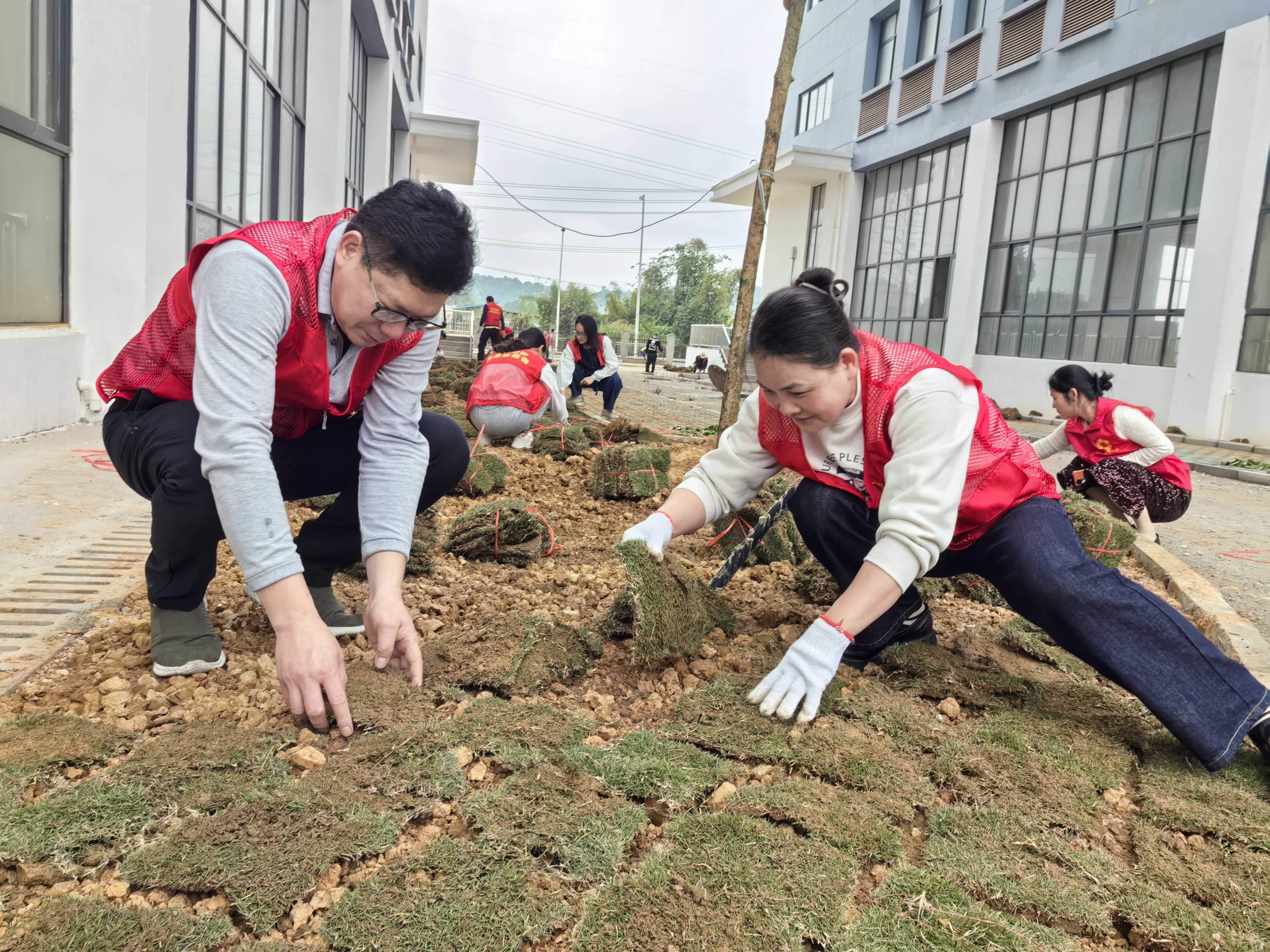 “這棵樹苗要扶正,不然長大后會(huì)歪的?!?/span>榮鑫公司黨支部委員、副總經(jīng)理唐欽月一邊指導(dǎo)身邊的同事,一邊用腳輕輕踩實(shí)樹苗周圍的泥土。她笑著說:“植樹就像培養(yǎng)孩子,一開始就要打下好基礎(chǔ)?!?/span>她的臉上掛著汗珠,但眼神中滿是認(rèn)真。不遠(yuǎn)處,年輕的入黨積極分子楊文君正和同事們一起鋪設(shè)草皮。他們動(dòng)作熟練,配合默契,不一會(huì)兒就鋪出了一大片嫩綠的草地。楊文君擦了擦額頭的汗水,笑著說:“今天雖然累,但看到這片新綠,心里特別踏實(shí)。作為入黨積極分子,能和黨員們一起為生態(tài)環(huán)境出一份力,感覺特別有意義。”